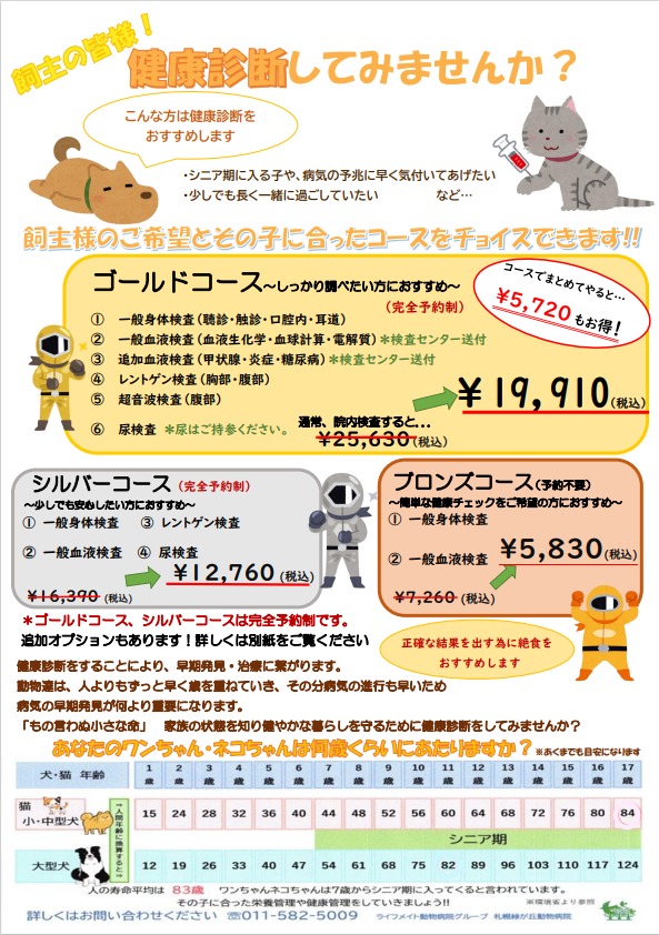 見た目ではわからない体の中の状態をチェック!しかも採血が1回で済むので怖い思いが少なくて済みます。人間の1年はワンちゃん・ネコちゃんにとって4年分。最低でも年に1回の健康診断が大切です。予防と早期発見早期治療でワンちゃん・ネコちゃんの健康をしっかり守りましょう!